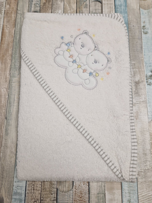 Unisex Baby White Knitted Shawl With Grey Satin Ribbon Bow