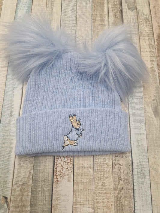 Baby Boys Blue Knitted Rabbit Double Blue Fluffy Pom Hat