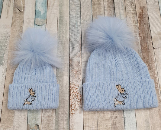 Baby Boys Knitted Blue Rabbit Fluffy Single Pom Hat