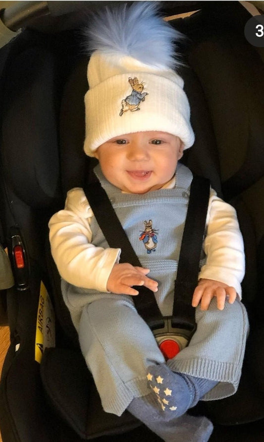 Baby Knitted Blue Double Fluffy Grey Faux Fur Pom Pom Hat