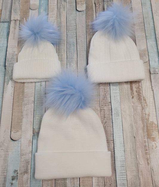Baby White Knitted Single Blue Fluffy Faux Fur Pom Hat