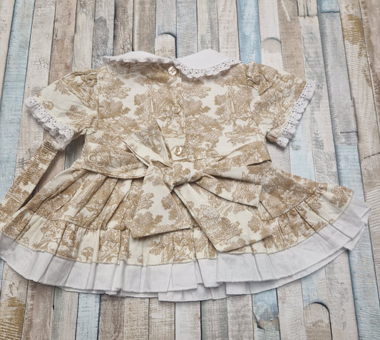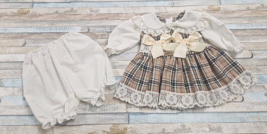 Baby Girls Fairy Tale Beige And Cream Tartan Dress And Bloomers.