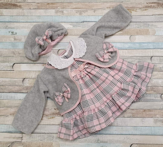 Baby Girls Pink And Grey Tartan Dress With Matching Jacket & Hat