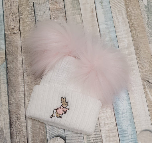 Baby White Hat With Pink Rabbit Double Pink Fluffy Faux Fur Pom Pom Hat