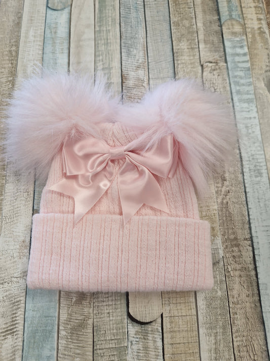 Baby Girls Pink Satin Bow And Fluffy Double Pom Hat