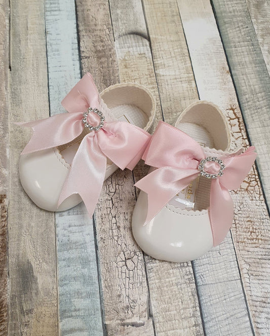White Patent Soft Bottom Diamante Pram Shoe With Pink Ribbon Bow