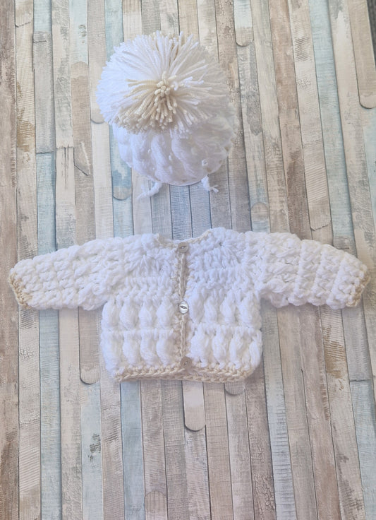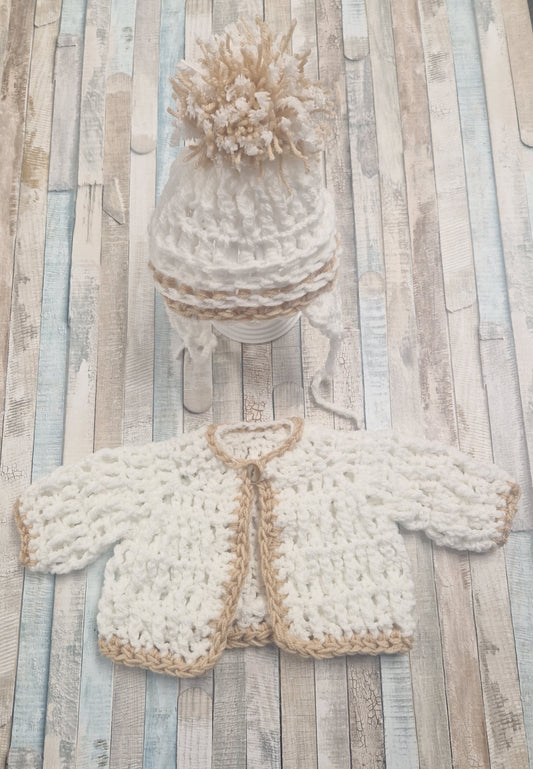 Baby Boys White And Beige Crochet Cardigan And Pom Pom Hat