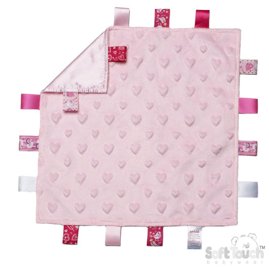 Tactile tags around the edges provide textural stimulation and tactile awareness, while the minky fabric keeps them warm and cozy.