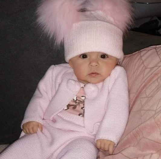 Baby Pink Knitted Double Pink Fluffy Faux Fur Pom Hat