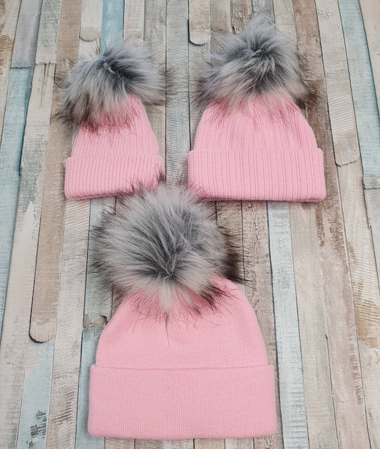 Baby Pink Knitted Single Grey Fluffy Faux Fur Pom Hat