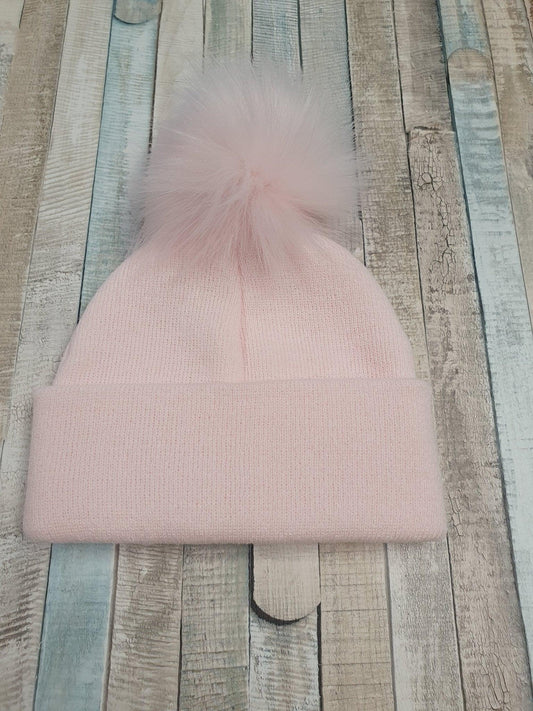 Baby Pink Knitted Single Pink Fluffy Faux Fur Pom Hat