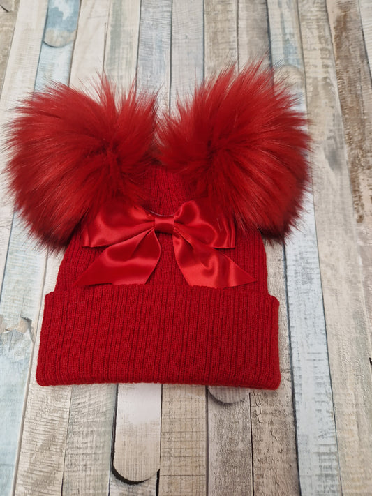 Baby Girls Red Satin Bow And Fluffy Double Pom Hat