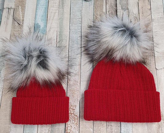 Baby Red Knitted Double Grey Fluffy Faux Fur Pom Hat