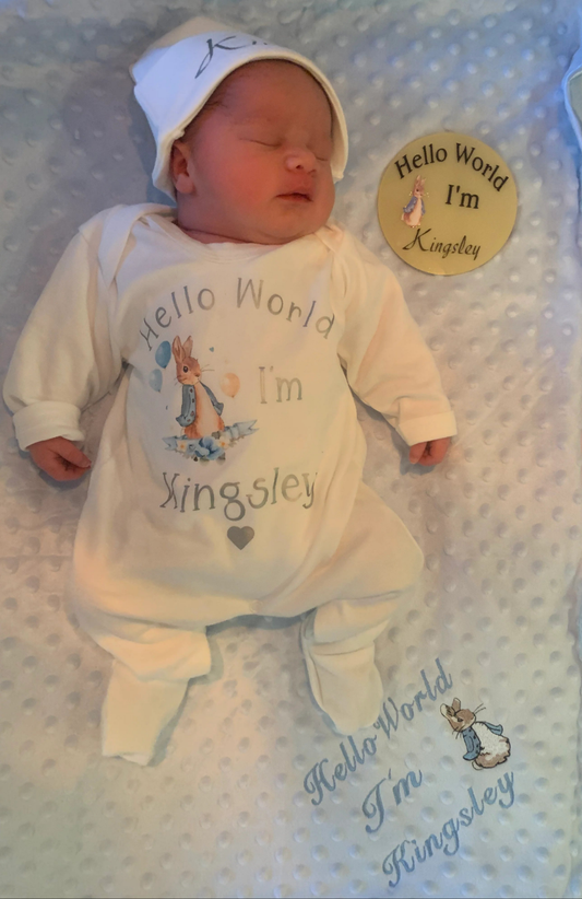 Personalised Clear Blue Rabbit Hello World Announcement Disc