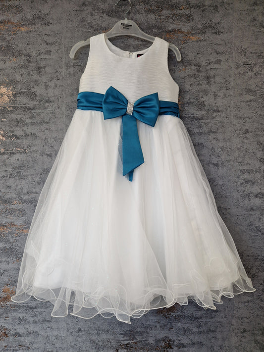 Girls Cream Sleeveless Dress With Diamante Teal Satin Bow