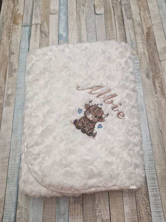 Personalised Baby Boys White Soft Rose Wrap Embroidered With Baby Highland Cow