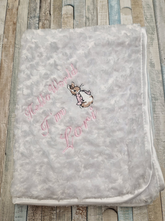 Personalised Hello World Pink Soft Rose Blanket/Wrap With Embroidered Pink Rabbit Design