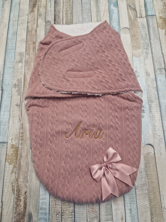 Personalised Baby Girls Dusky Pink New Cable Style Swaddle With Satin Bow