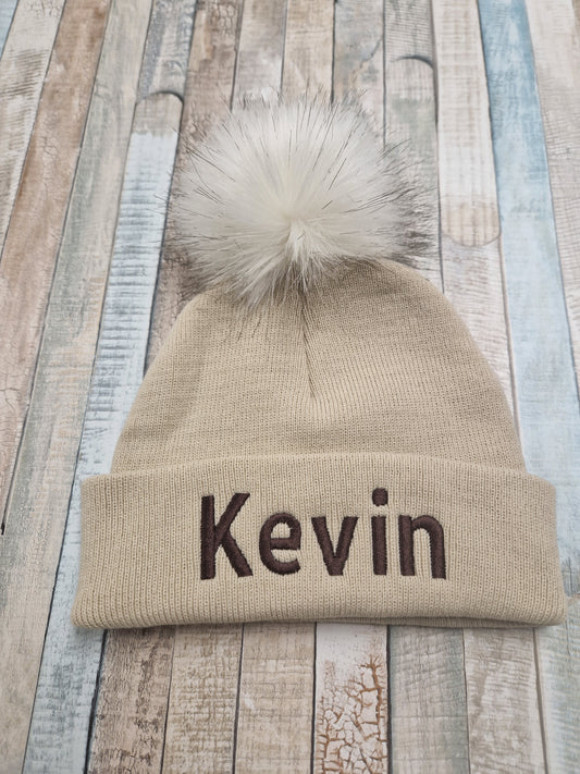 Personalised Baby Beige Single Fluffy Faux Fur Pom Knitted Hat