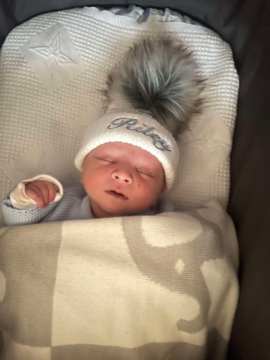 Personalised Baby Beige Double Fluffy Faux Fur Pom Knitted Hat