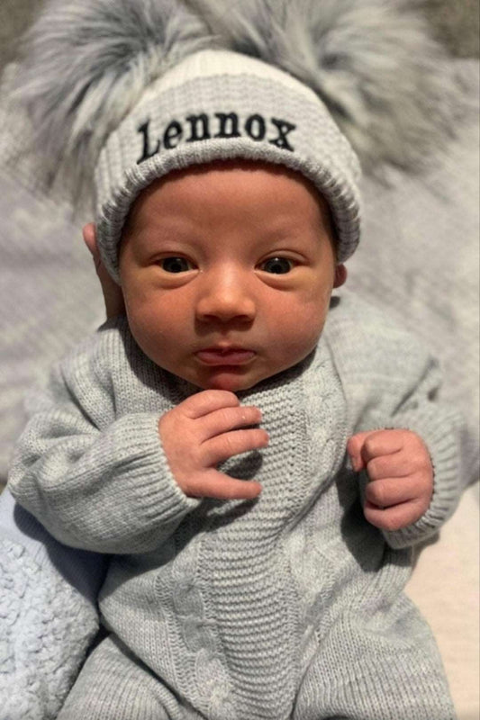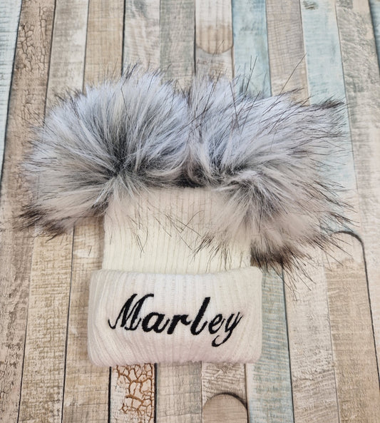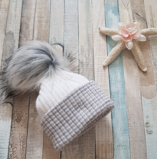 Personalised Baby White Knitted Double Grey Fluffy Faux Fur Pom Hat