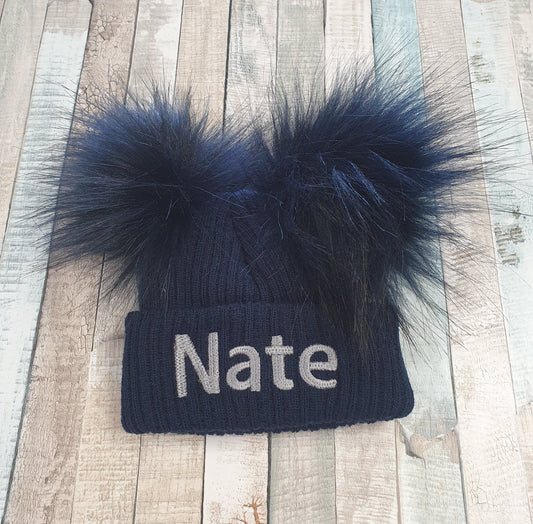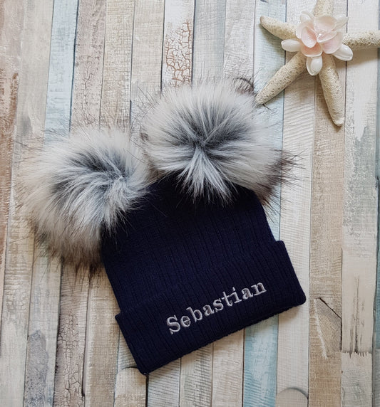 Personalised Baby Navy Knitted Double Grey Fluffy Faux Fur Pom Hat