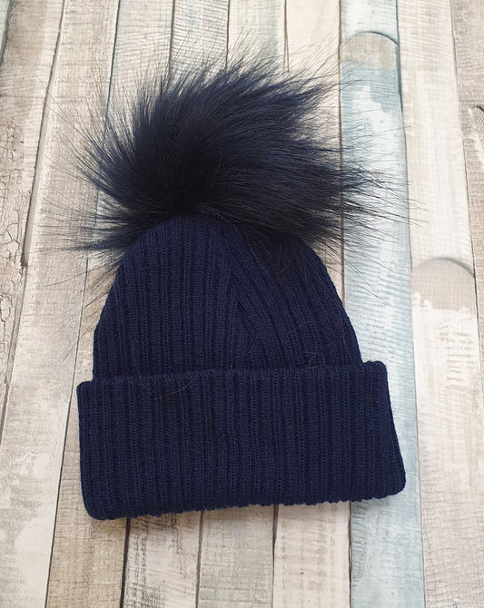 Personalised Baby Navy Knitted Single Navy Fluffy Faux Fur Pom Hat