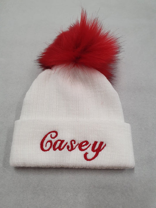 Personalised Baby White Knitted Single Red Fluffy Faux Fur Pom Hat