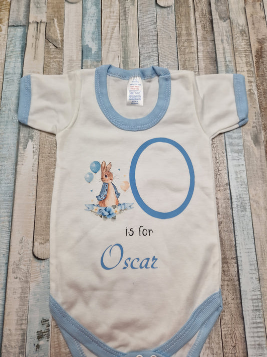 Personalised White Babygro With Printed Blue Rabbit Initial And Name