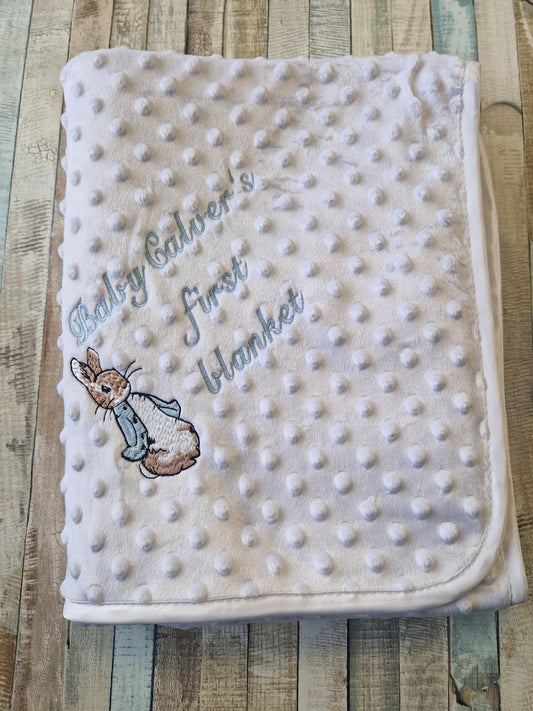 Personalised White Dimple Baby Blanket With Blue Rabbit