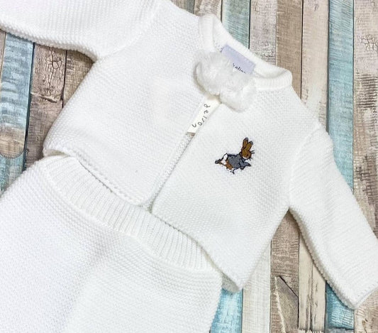 Unisex Baby White Knitted Pom Set With Embroidered Rabbit Design