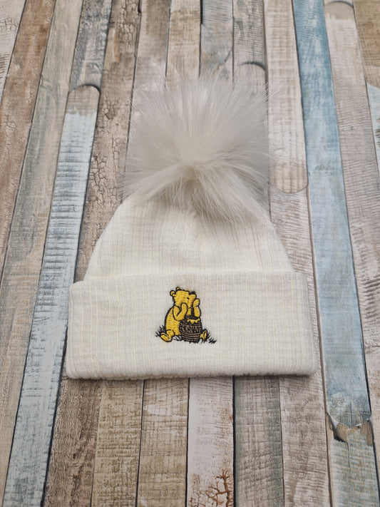 Unisex Baby Knitted White Single Fluffy Pom Bear Design Hat