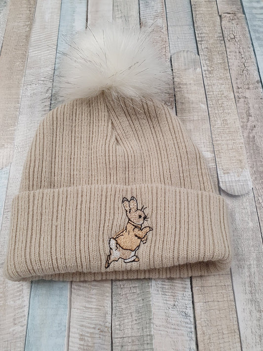 Unisex Baby Knitted Beige Single Fluffy Pom With Gold Rabbit Hat