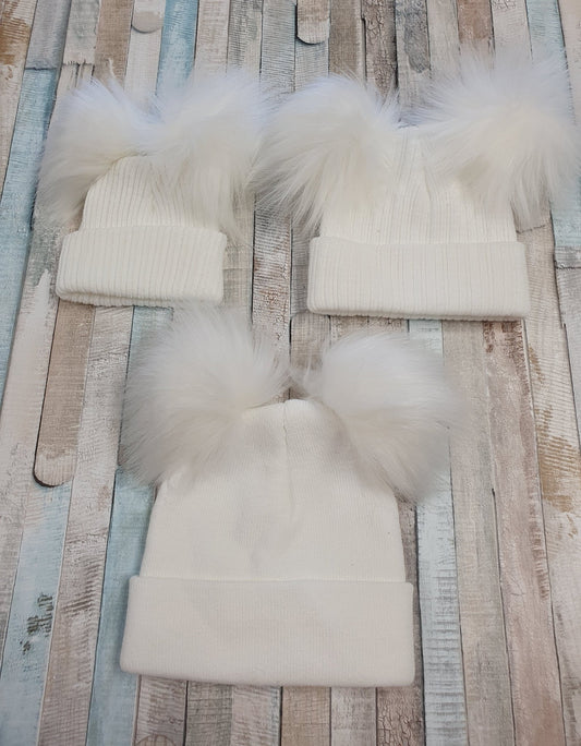 Baby White Knitted Double White Fluffy Faux Fur Pom Hat