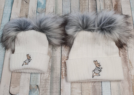 Baby White Knitted Grey Rabbit Double Grey Fluffy Faux Fur Pom Hat