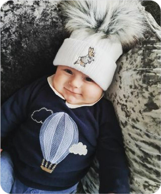 Baby White Knitted Rabbit Single Grey Fluffy Faux Fur Pom Hat