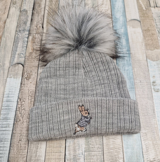 Baby Knitted Grey Rabbit Fluffy Single Pom Hat