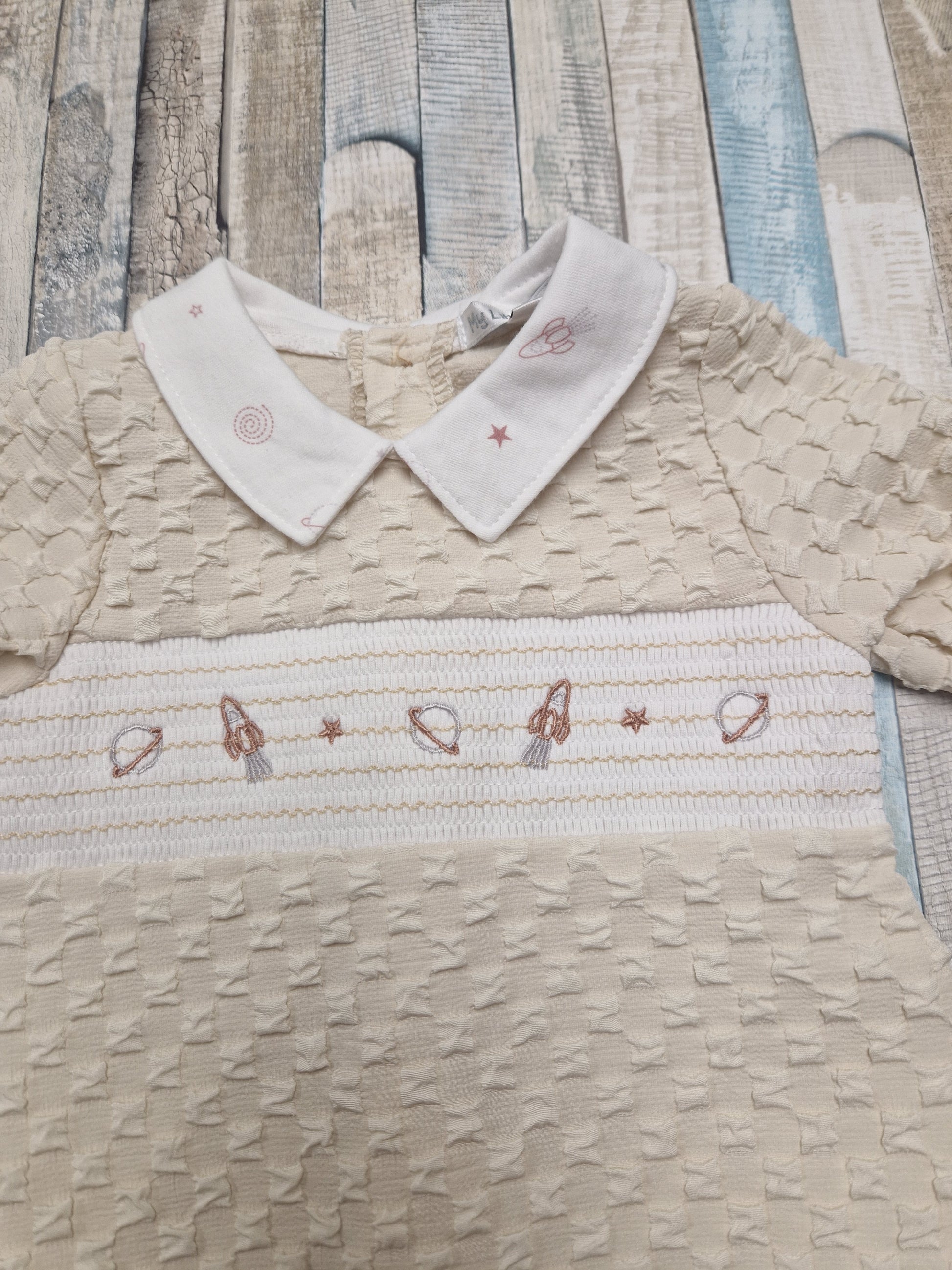 This beige smocked babygro features a charming printed space design around the collar, combining comfort with a subtle cosmic touch. Crafted for baby boys, it offers gentle fabric ideal for sensitive skin, ensuring ease of movement and all-day wearability. The smocking adds a classic, tailored detail while maintaining softness, perfect for everyday use or special occasions.