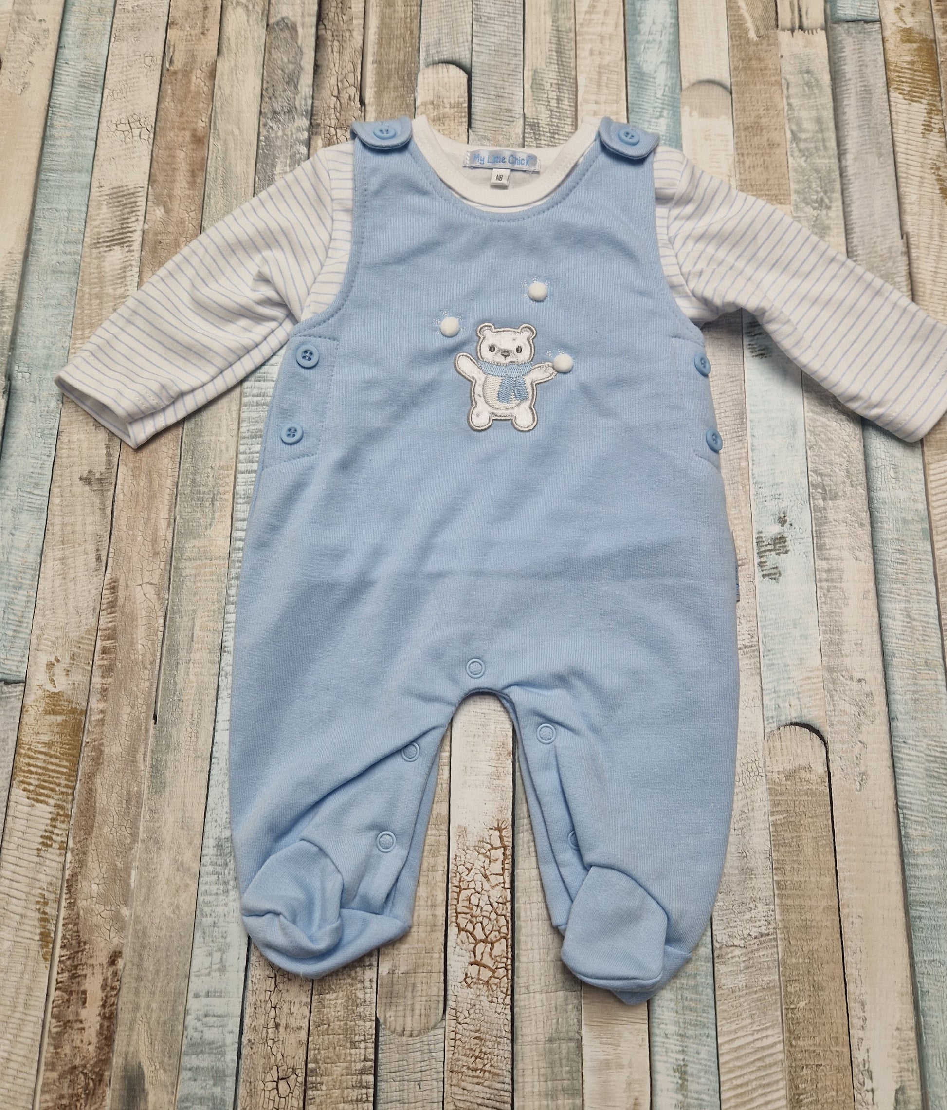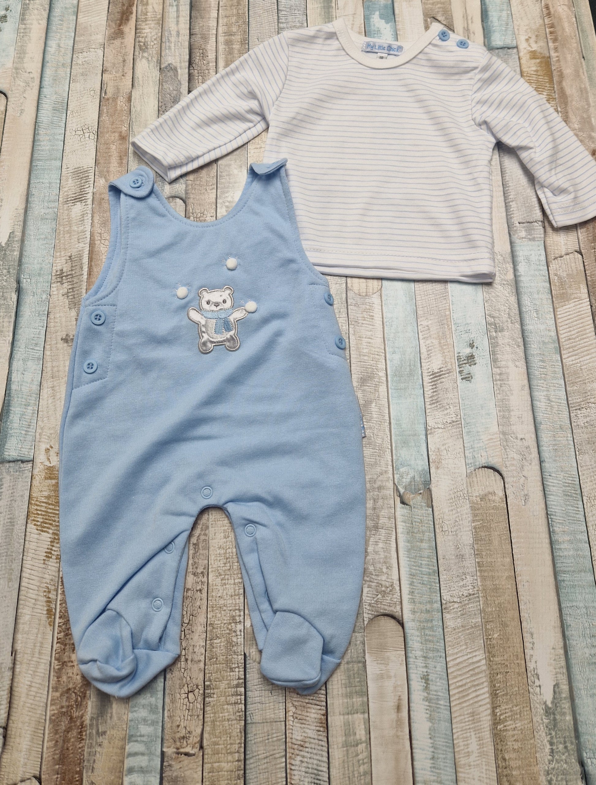 Baby Boys Blue And White Teddy And Snowball Design Dungaree Set