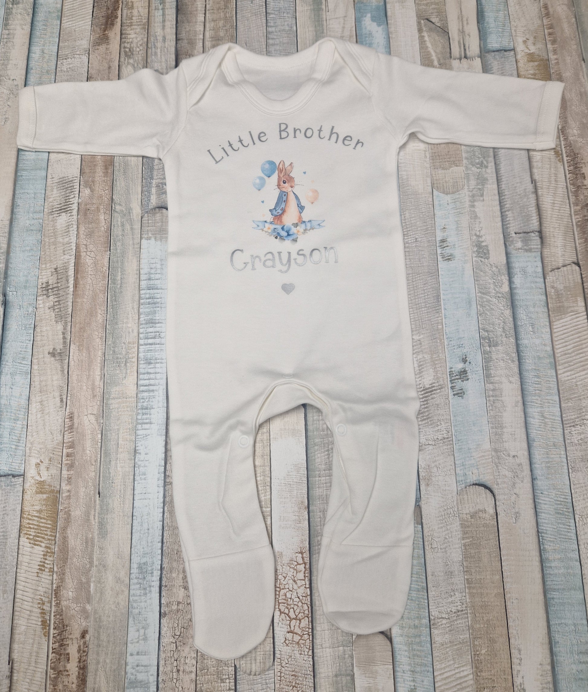 Baby Boys Printed Personalised Little Brother Babygro With Blue Rabbit