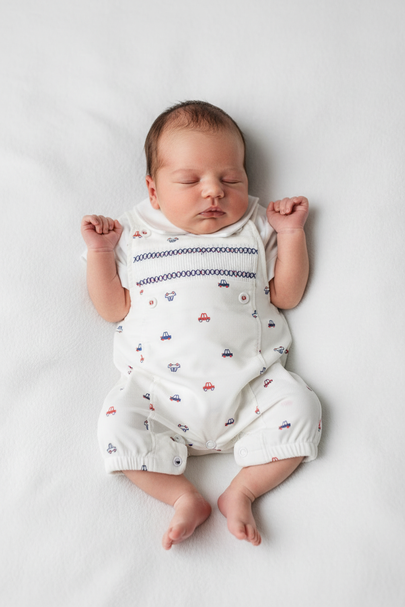 Baby Boys White Cars Dungaree 2 Piece Set Crafted for comfort and style, this two-piece dungaree set features a charming white base adorned with playful car motifs that appeal to little ones. The dungaree design offers practical functionality with secure fastenings, whilst the coordinating piece ensures a polished, put-together look. Constructed from soft, breathable fabric, this set is ideal for everyday wear, playdates, or special occasions. Easy to care for and designed to withstand active play, it's a versatile addition to any baby boy's wardrobe that combines durability with contemporary design.