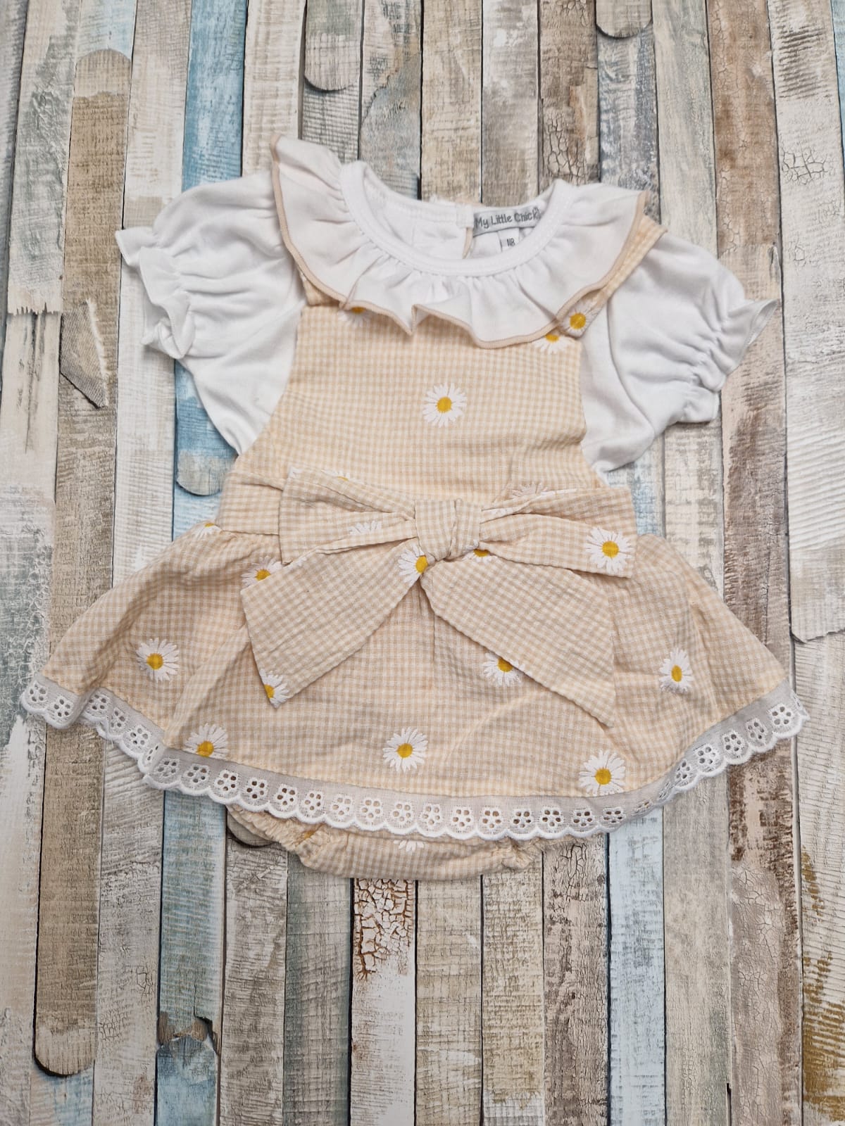 Baby Girls Beige And White Gingham Dungaree Dress Set with Lace and Bow This sophisticated two-piece ensemble showcases a refined beige and white gingham pattern that exudes understated elegance. The dungaree dress is thoughtfully designed with delicate lace detailing and an accompanying bow accent, offering a polished aesthetic suitable for both casual outings and formal occasions. The neutral colour palette ensures versatility, coordinating seamlessly with existing pieces in your child's collection. Constructed with quality fabrics that prioritise comfort and longevity, this set represents a discerning choice for parents who value both style and practicality. An investment piece that transcends seasonal trends.