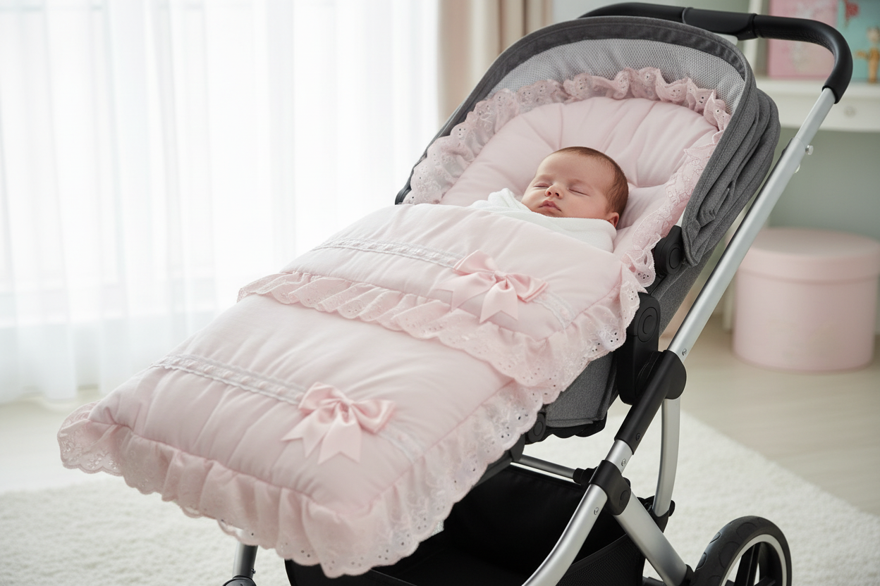 Keep your little one cosy during outdoor adventures with this universal pushchair footmuff, designed for newborns and infants. The soft pink frill detailing adds a charming touch, while the delicate satin bow accent brings elegance to your pram. Crafted for comfort and warmth, this footmuff fits most standard pushchair models, making it a practical essential for year-round use. The durable construction ensures lasting wear through multiple seasons, protecting your baby from wind and cold whilst maintaining breathability. An ideal gift for new parents seeking both style and functionality.