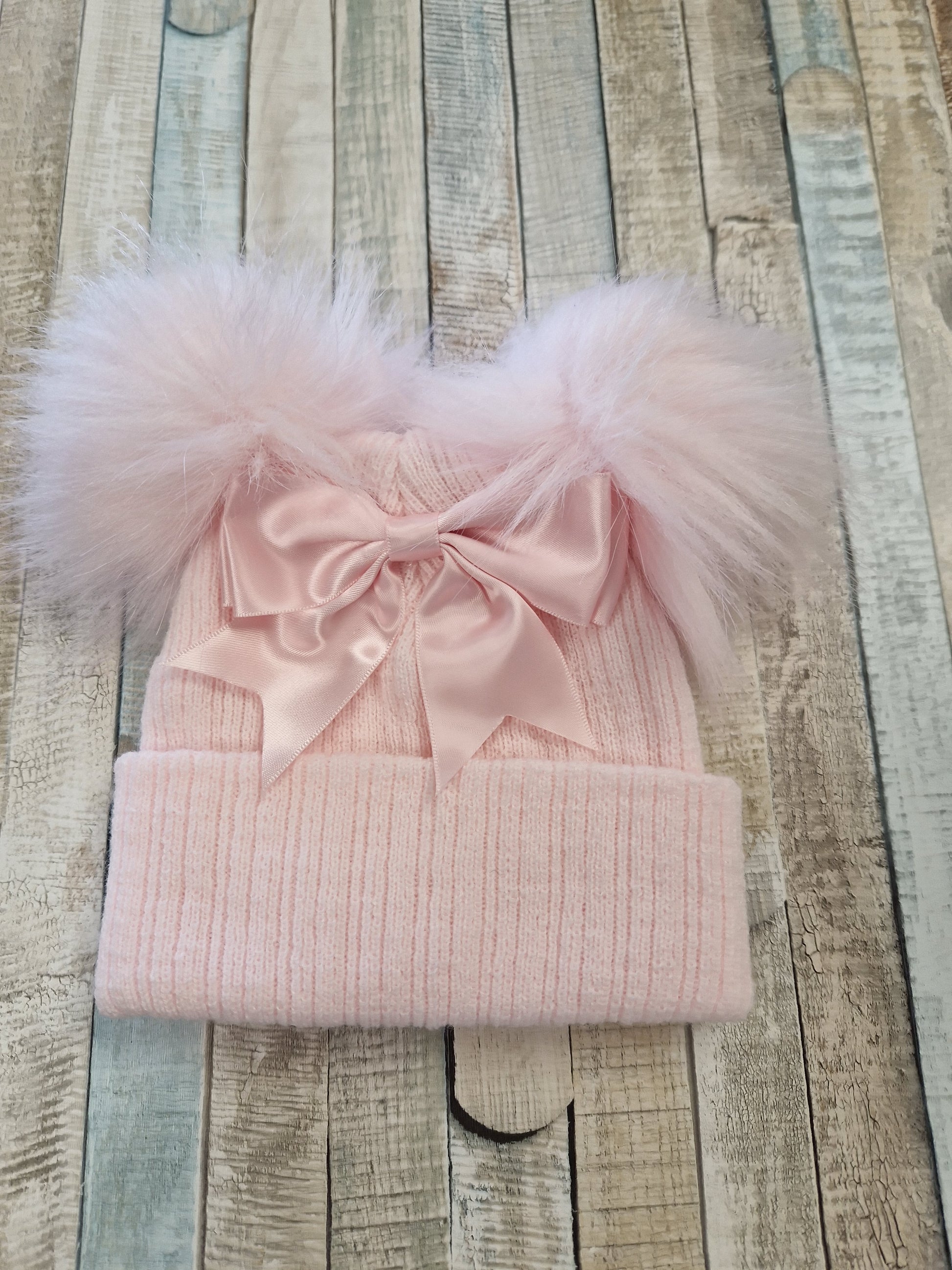 Keep your little girl warm and stylish with this exquisite baby girls pink satin bow and fluffy double pom hat.