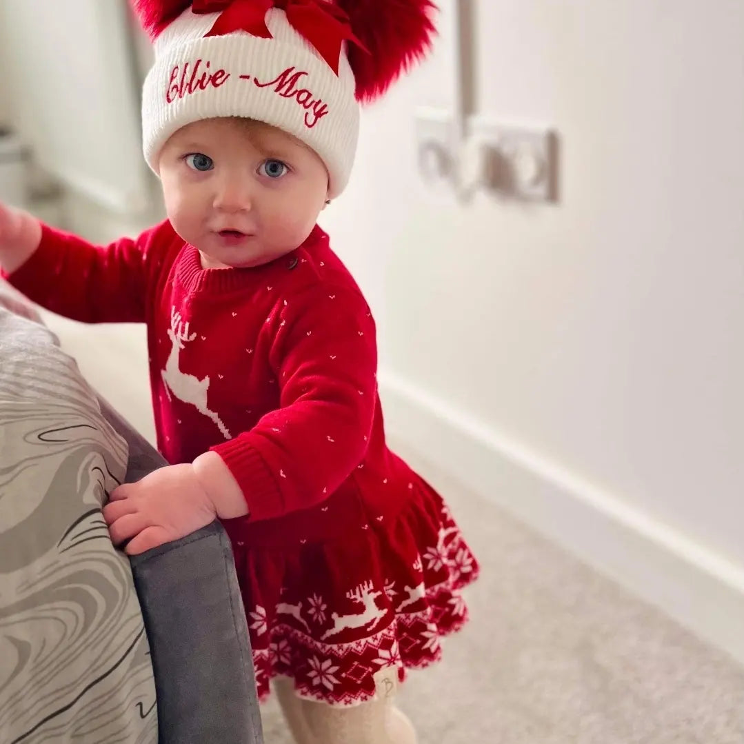 Keep your little girl warm and stylish with this exquisite baby girls white and red bow and fluffy double pom hat.