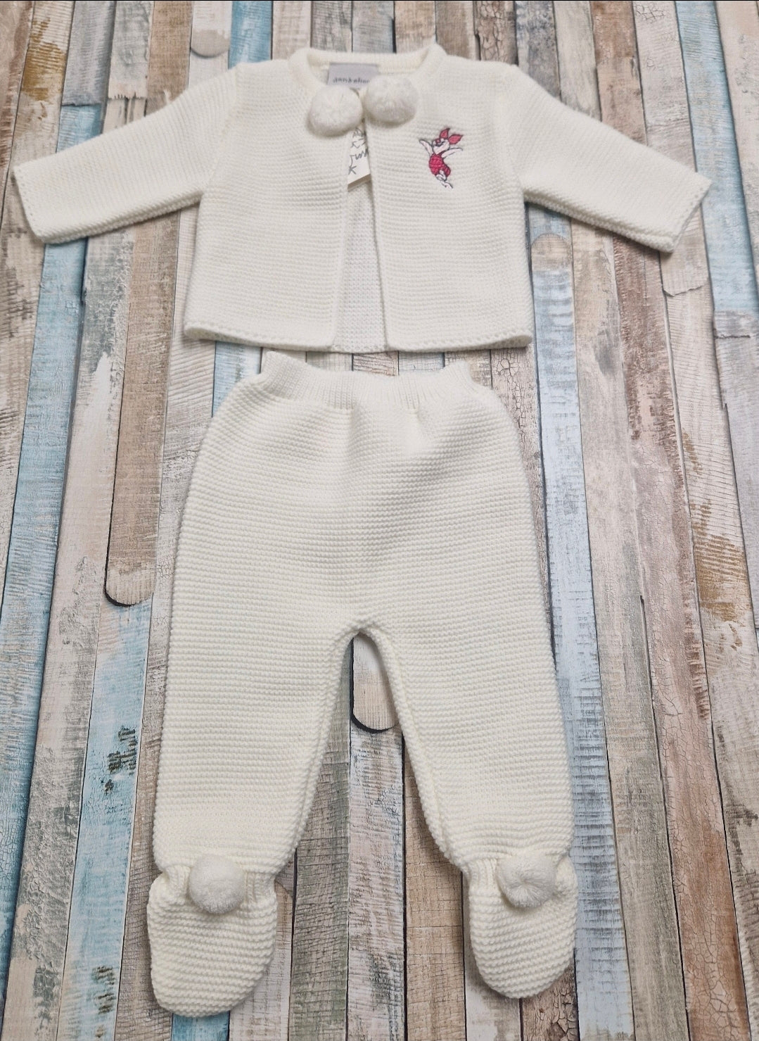 This adorable Baby Girls White Pom Pom Set features a cute embroidered piglet design.