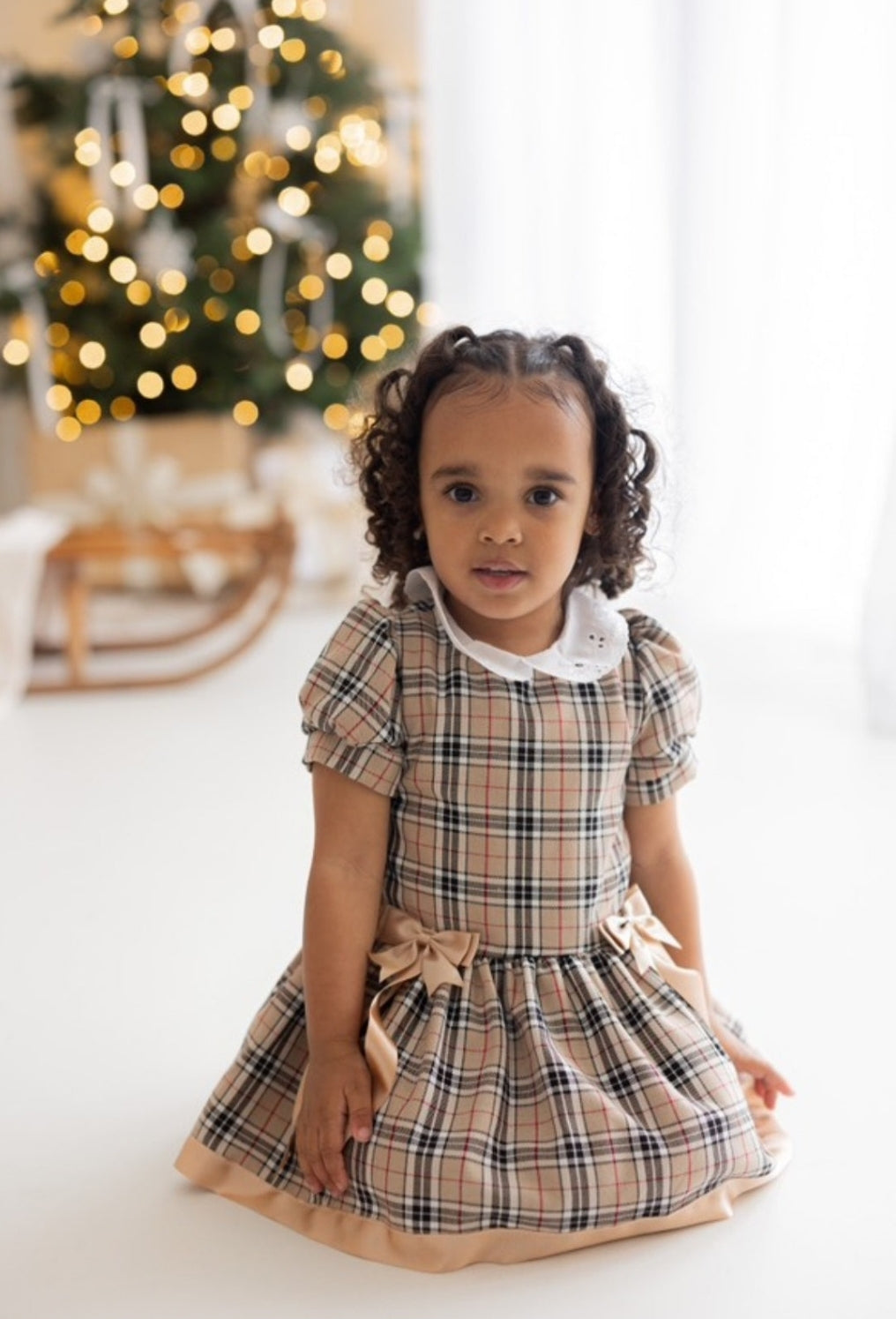 Introducing our Baby Girls Gold & Beige Tartan Dress, an elegant choice for special