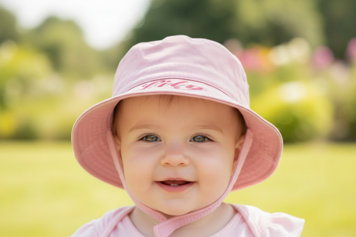 Personalised Baby Girls Pink Bucket Hat With Chin Strap