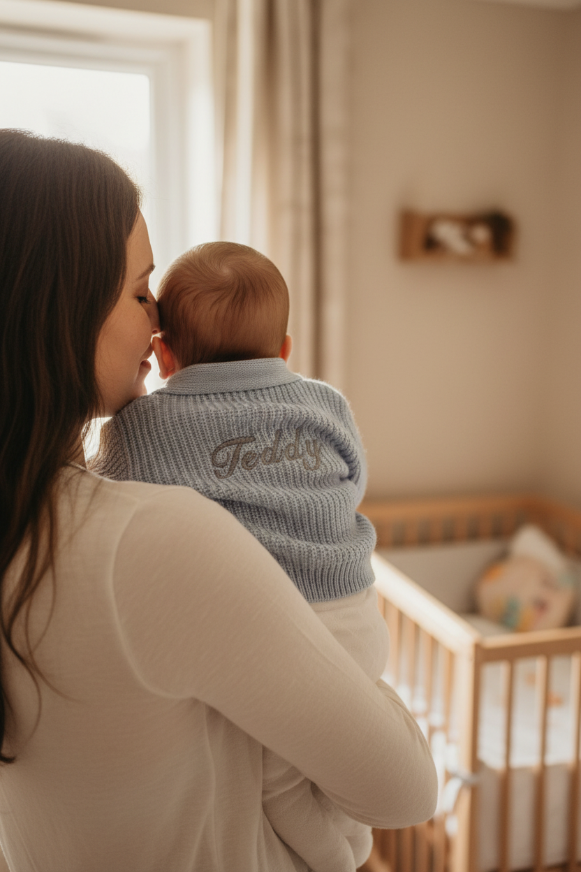 This personalised blue ribbed cardigan is crafted specifically for baby boys, combining comfort with a tailored fit. The soft ribbed fabric ensures gentle warmth and flexibility, ideal for delicate skin. Personalisation adds a unique touch, making it a thoughtful gift or a special keepsake. Expertly designed to balance style and practicality, this cardigan is perfect for layering during cooler days while maintaining a classic, timeless look.
