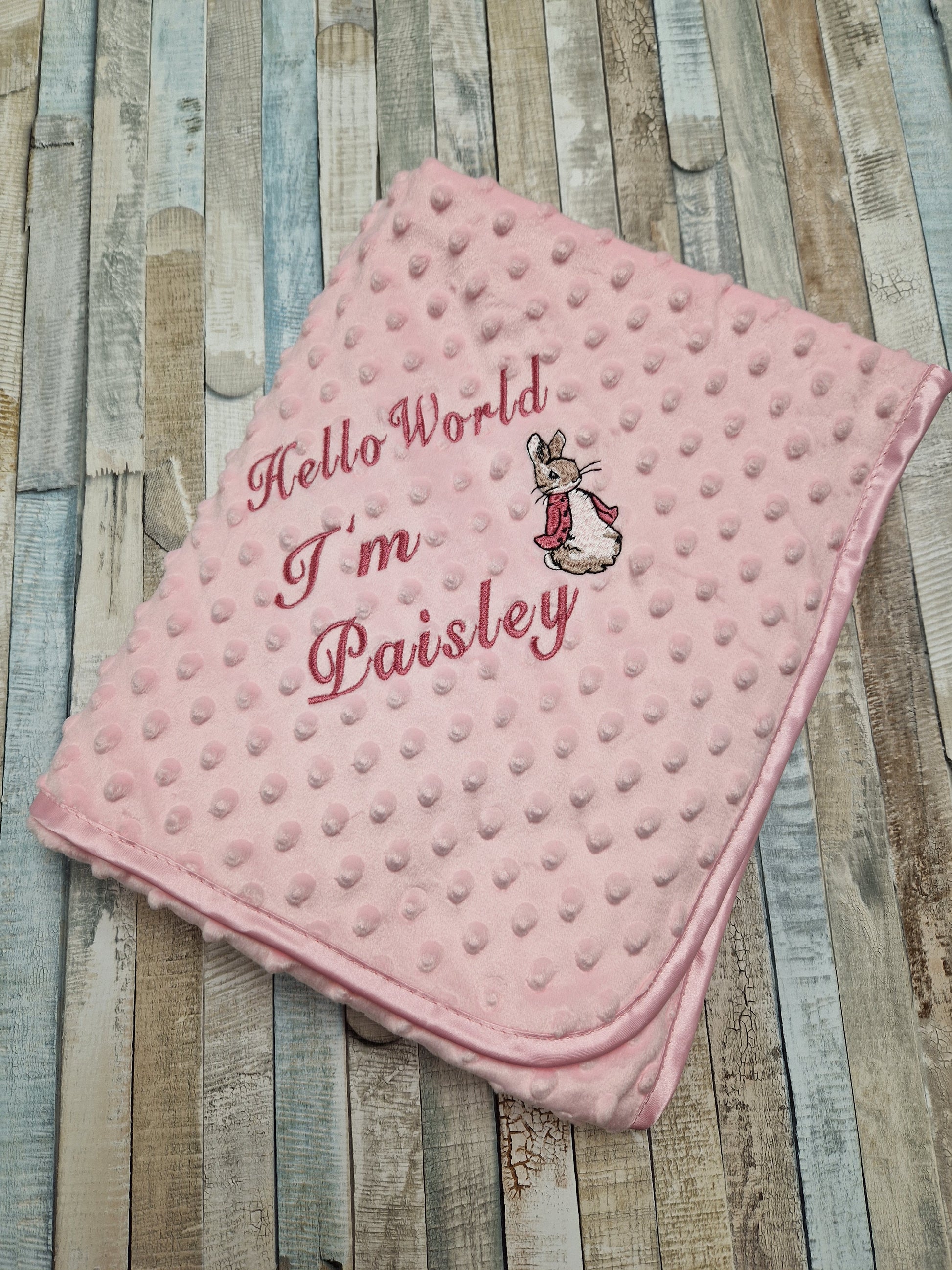 Personalised Hello World Pink Dimple Blanket/Wrap With Embroidered Pink Rabbit Design